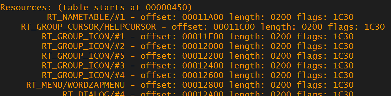 NE files support resources. Resources are embedded assets such as icons, bitmaps, menus etc… and each resource has a type and a name.